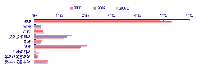 从2005-2007年汽车子 行业 销量结构变化中可以看出,轿车销量占比已经超过50%,并保持上升势头。