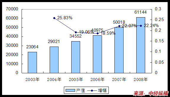 2003-2008年我国建筑 行业 工业总产值及其增幅