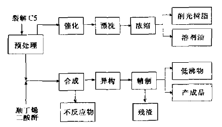裂解原料C5用DMF抽提蒸馏进行预处理,切割富含甲基丁二烯的中间馏份,在溶剂中与顺丁烯二酸酐反应; 反应结束后,蒸除未反应的成份,再经异构化成液态酸酐,通过减压精馏,得到成品。C5馏份提取甲基丁二烯的剩余部分催化台成半削光树脂,副产溶剂油。
