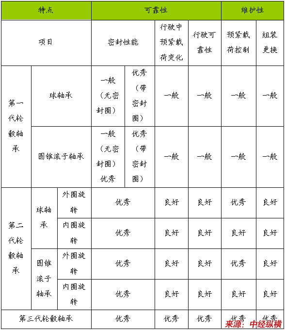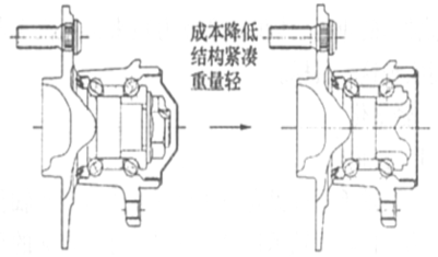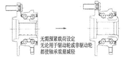 轮毂轴承通过提高一体化程度来减轻车轴重量。第二代轮毂轴承比第一代减少了180g的重量,而第三代轮毂轴承又减少了120g的重量。