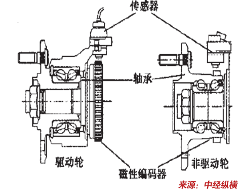 无源传感器(检测磁通量型传感器)是一种常用的传感器。当传感器转子旋转时,无源传感单元中的磁通量变化使传感元件产生正弦电流。转子的转速增大时,频率和电压也随之增大。但频率和电压与转子转速成正比,因此在低速行驶时由于频率较小,很难测量车轮速度。