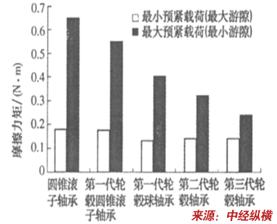 不同类型轮毂轴承摩擦力矩的比较(500r/min的行驶速度下)