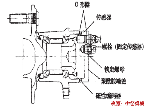 非驱动轮用内置环状传感器轮毂轴承结构紧凑、重量轻,有效利用了轮毂和轴承的内部空间。这种结构的传感转子输出信号强,低速行驶时无源传感元件也可测量车轮速度。