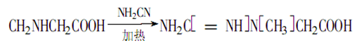 2)用氨基氰与肌氨酸钠或肌氨酸钾在水中或在水与有机溶剂的混合物中,在温度为20℃~150℃,PH为7~14条件下进行。