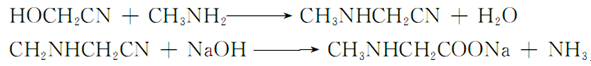 将羟基乙腈与甲胺在低温(10~15℃)下缩合得甲胺基乙腈,再经NaOH溶液水解得肌氨酸钠。合成甲氨基乙腈:羟基乙腈/甲胺摩尔比1:1.05,羟基乙腈缓缓加入甲胺中,加完后再保温反应1H即可;合成肌氨酸钠:用30%NaOH溶液在90~100℃下水解甲胺基乙腈,NaOH过量20%,水解至NH3排净为止。
