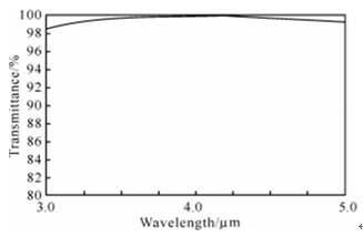 为了改进薄膜的机械强度,经过多次实验,最终选择离子辅助沉积硫化锌作高折射率层,2种材料共蒸发产生的材料F做低折射率层来完成工艺。考虑到材料在不同蒸镀条件下的折射率有所不同,先在北仪ZZSX-1100Z型镀膜机上进行材料实验。由在锗上镀单层ZnS薄膜后测得的光谱曲线可以计算出硫化锌在4um处的折射率为nzns=2.2。同样的方法计算出材料A在4um处折射率nA=1.35的理论曲线如下图所示。
