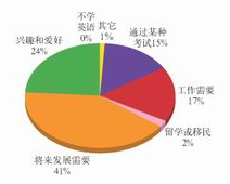 英语学习动机 分析 在学英语动机的调查中,“将来发展需要”所占的比例最大,可见英语作为一门外语,其重要性得到了越来越多人的认可,这为在线英语培训提供了广阔的市场空间。兴趣、工作、考试的需要也占较大比重。需要注意的是,这是英语学习的动机,并不是参加培训的动机,实际上通过某种考试是学习者参加培训的主要动机之一。