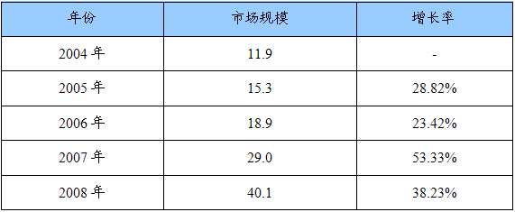 2004-2008年我国英语在线培训市场规模及增长率