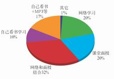 在英语学习方式上,最受欢迎的英语学习方式是面授与网络相结合的方式,可见传统面授培训和网络远程培训相结合的方式优势互补、各取所长。面授教学和网络学习并驾齐驱,说明面授和网络学习各有所长,面授教学师生互动性强、有现场氛围,网络学习不受时空限制。通过书籍和MP3等音像资料学习英语也有一定比重。