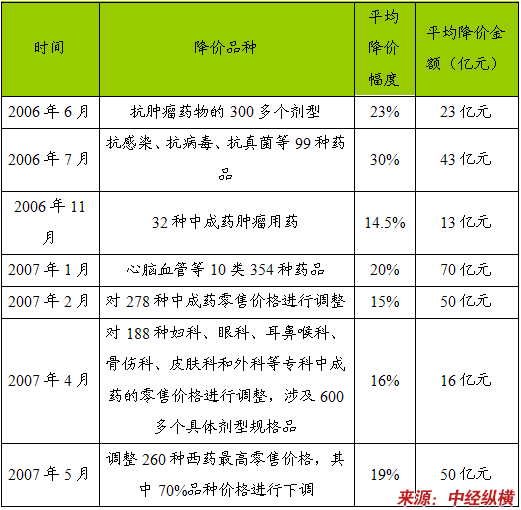2006年,国家发改委三次下调药品价格;2007年,四次下调药品价格,共802种药品价格得到调整,其中降价品种占70%,平均降价幅度达19-20%,最大降幅达85%;其余30%的廉价药品维持原价。至上半年,发改委宣布本轮药品价格调整结束。