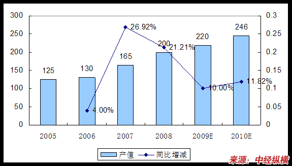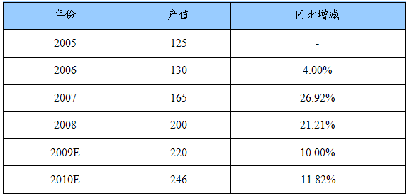 2005—2010年真空金属镀膜产品产值 分析 及预测表