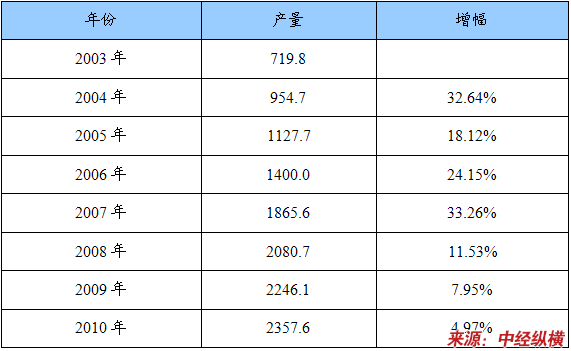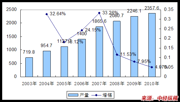 2003-2010年我国金属维护结构产品产量统计及预测表