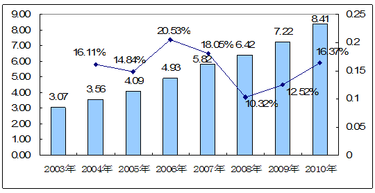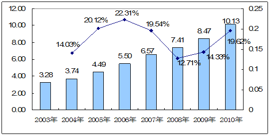 2003——2010年肌酸市场规模及预测图 单位:亿元