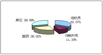 肌酸产品目前的主要消费群体为运动员,另外其在医药领域的消费达到了26.02%,也占到了相当高的比例。而作为体能补充保健品的消费仅占到11.33%。这主要是因为肌酸消费对于大多数人来说还是比较生僻的产品,市场对其了解程度不够,以至于其消费市场还未被完全发掘。