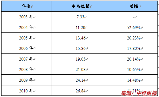 2003-2010年我国吉西他滨市场规模统计及预测表 单位:亿元