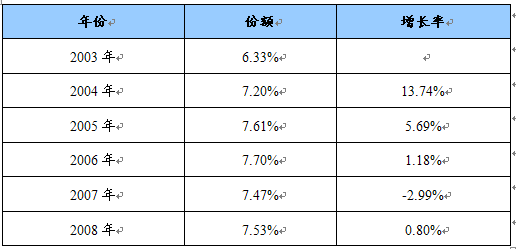 2003-2008年吉西他滨在抗肿瘤药物所占市场份额及增长率