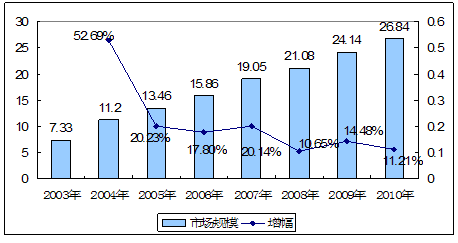 2003-2010年我国吉西他滨市场规模趋势图 单位:亿元