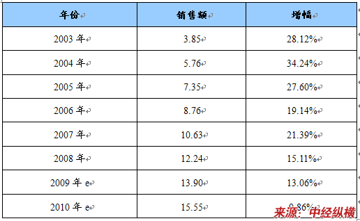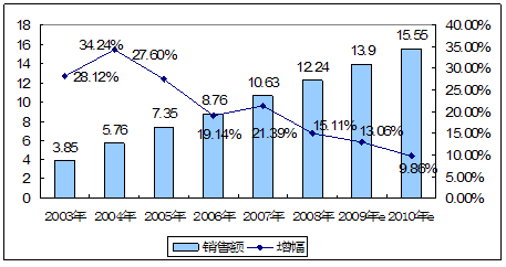 2003-2010年我国吉西他滨产品销售额趋势图