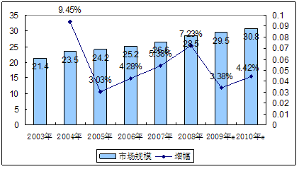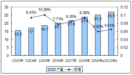 2003-2010年我国脊柱内固定器产品产量统计及预测图 单位:万套