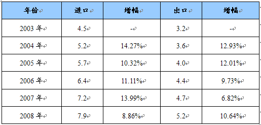 2003-2008年我国脊柱内固定器进出口量值统计 单位:万套