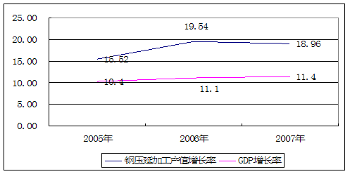 从图中可以看出,精密带钢 行业 产值增幅与与国家宏观经济环境相关程度较大,随着GDP的增加,产值增加, 行业 工业总产值增长率高于国家GDP增长率, 行业 前景看好。