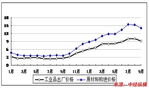 生产资料价格涨幅高位回落。9月份,流通环节生产资料价格比上月下降2.4%,已连续2个月环比下降;同比上涨17.5%,涨幅比上月回落5个百分点。工业品出厂价格同比上涨9.1%,比上月回落1个百分点;原材料、燃料、动力价格上涨14%。