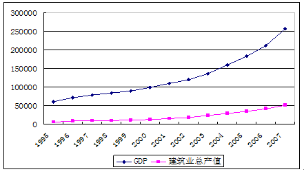 从曲线可以看出,建筑产业与GDP存在着十分密切的关系。1995~2007年建筑业总产值与GDP的相关系数为0.9984。