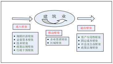 市场壁垒从新企业进入市场角度来考察市场关系的调整和变化,考察产业内已有企业和准备进入企业的竞争关系,反映的是市场中潜在的竞争强度,不同流派的产业经济理论都认为,市场壁垒是影响市场分额及由此确定的集中度的决定因素。建筑业产业壁垒主要集中如下图所示。
