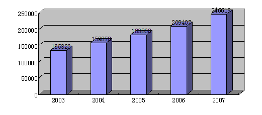 2007年国民经济保持高速平稳增长的态势。2007年国内生产总值246619亿元,比上年增长11.4%。分产业看,第一产业增加值28910亿元,增长3.7%;第二产业增加值121381亿元,增长13.4%;第三产业增加值96328亿元,增长11.4%。第一产业增加值占国内生产总值的比重为11.7%,与上年持平;第二产业增加值比重为49.2%,上升0.3个百分点;第三产业增加值比重为39.1%,下降0.3个百分点。分季度看,一季度增长11.1%,二季度增长11.9%,三季度增长11.5%,四季度增长11.2%。