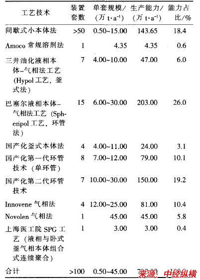 截至2008年底,我国聚丙烯生产企业已超过80家,生产装置100余套。成为仅次于美国的世界第二大聚丙烯生产国。目前我国已经基本上形成了溶剂法、液相本体一气相法、间歇式液相本体法、气相法等多种生产工艺并举,大、中、小型生产规模共存的生产格局。其中,连续法装置46套.生产能力为636万t/a,占国内总生产能力的81.6%左右:此外,我国还存在大量间歇法小本体聚丙烯装置,单套年产量不足万吨,至多十几万吨.而合计能力超过100万t/a,约占国内总生产能力的18-4%左右。