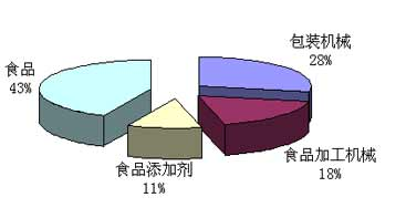 从07年食品工业供应最关注的产品比例图,可以看出食品占42%,其次包装机械占24%,食品加工机械占21%,添加剂9%。