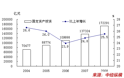 2008年全年全社会固定资产投资172291亿元,比上年增长25.5%。分城乡看,城镇投资148167亿元,增长26.1%;农村投资24124亿元,增长21.5%。分地区看,东部地区投资87412亿元,比上年增长20.9%;中部地区投资45384亿元,增长32.6%;西部地区投资35839亿元,增长26.9%。