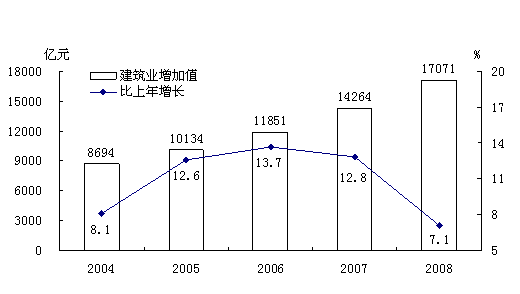 全年全社会建筑业实现增加值17071亿元,比上年增长7.1%。全国具有资质等级的总承包和专业承包建筑业企业实现利润1756亿元,增长12.5%,其中国有及国有控股企业509亿元,增长21.8%;上缴税金2058亿元,增长20.0%,其中国有及国有控股企业771亿元,增长24.7%。