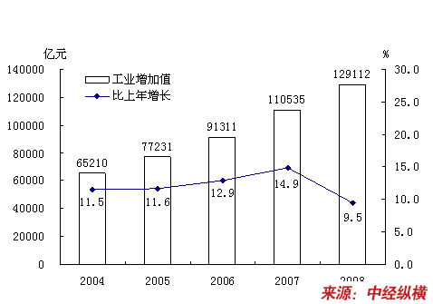 全年全部工业增加值129112亿元,比上年增长9.5%。规模以上工业增加值增长12.9%,其中国有及国有控股企业增长9.1%;集体企业增长8.1%,股份制企业增长15.0%,外商及港澳台商投资企业增长9.9%;私营企业增长20.4%。分轻重工业看,轻工业增长12.3%,重工业增长13.2%。
