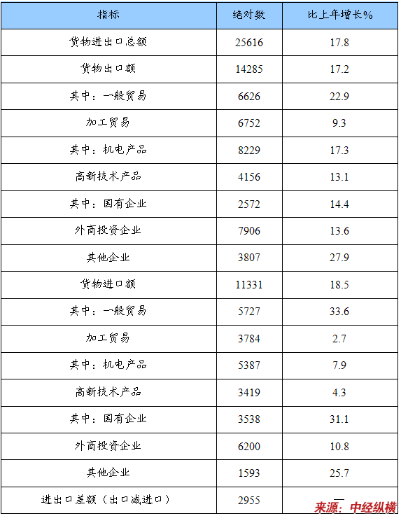 全年货物进出口总额25616亿美元,比上年增长17.8%。其中,货物出口14285亿美元,增长17.2%;货物进口11331亿美元,增长18.5%。进出口差额(出口减进口)2955亿美元,比上年增加328亿美元。