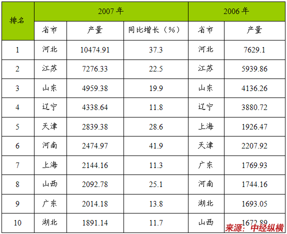 生产省份来看,2007年,钢材产量居全国前十位的省市共生产钢材40505.87万吨,占全国总产量的71.74%,同比新增钢材产量7905.4万吨,增长24.25%,比全国平均增速高1.55个百分点。