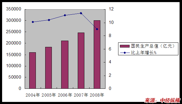 2008年国内生产总值300670亿元,比上年增长9.0%。分季度看,一季度增长10.6%,二季度增长10.1%,三季度增长9.0%,四季度增长6.8%。分产业看,第一产业增加值34000亿元,增长5.5%;第二产业增加值146183亿元,增长9.3%;第三产业增加值120487亿元,增长9.5%。