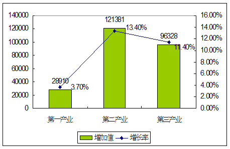 受世界经济快速增长和国内需求旺盛的拉动,全年国内生产总值246619亿元,比上年增长11.4%。分产业看,第一产业增加值28910亿元,增长3.7%;第二产业增加值121381亿元,增长13.4%;第三产业增加值96328亿元,增长11.4%。第一产业增加值占国内生产总值的比重为11.7%,与上年持平;第二产业增加值比重为49.2%,上升0.3个百分点;第三产业增加值比重为39.1%,下降0.3个百分点。分季度看,一季度增长11.1%,二季度增长11.9%,三季度增长11.5%,四季度增长11.2%。