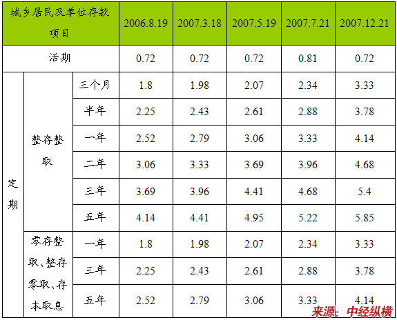 2007年中国人民银行6次上调人民币存贷款利率,一年期存款利率从2.79%上调到4.14%。2007年我国国民经济平稳快速发展,宏观调控进一步加强和改善;人民币汇率形成机制改革稳步实施,汇率弹性逐步增强;外汇储备继续快速增长,应对外部冲击的能力不断增强;财政收入、企业利润和居民收入大幅提高,财政、企业、居民的偿债能力不断增强;金融机构改革继续深化,公司治理进一步加强;金融 市场发展 迅速,运行总体平稳。