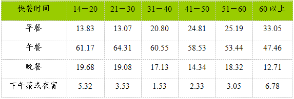 综合 分析 显示:午餐吃快餐的人最多,私企、三资企业中午餐吃快餐的比例高于其他企业类型,因为国有企业中可以回家或带饭在单位吃的人比例更高,午餐时人们最常吃的是米饭套餐,以中青年工作人群为主,在五市中广州人午餐吃快餐的比例最高;早餐吃快餐的通常在国有企业工作的中年及老年人,他们常在附近的小店或晚餐吃些馄饨、包子、面条等面食,以武汉、沈阳最为典型;晚餐吃快餐的人是年轻人,他们或在学校上学或在三资、私企事业、股分制单位工作,吃些汉堡包、比萨饼、薯条等西式快餐,其中一些是因为加班或没有家,另一些是因为不少人在私人约会时,如果不是吃请性质,通常会选择吃快餐的方式谈谈天等比较自然也不算太破费,以北京、上海更为普遍。