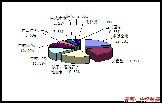 近年来,人们最常吃的快餐还是米饭套餐,21%的市民最常吃的是米饭套餐这种中国式的快餐,但值得注意的是汉堡包这种典型的西式快餐直逼其后,所拥有的客户群体比例仅比米饭套餐低不到百分之一。饺子、馄饨、面条等面食也是颇受欢迎的。
