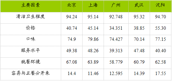 不同城市由于经济水平及文化传统不同,在考虑因素上也会有所体现。五个城市中,对价格及口味最看重的是沈阳,北京和上海最强调就餐环境和服务水平,广州在各个方面的注重程度都最低,这可能与广州人最爱吃有关。