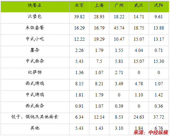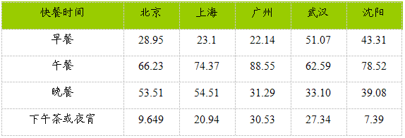 在五个城市中,广州常住人口中的外来人口比例大,大多中午不能回家吃饭,生活节奏快,广州人午餐时吃快餐的比例最高,这时他们最爱吃的是米饭套餐;北京上海这两个现代化都市,受西式生活方式的影响也较大,晚餐时吃快餐的比例高于别的城市,他们最喜欢的是汉堡包;显然五个城市中,武汉和沈阳两个内地城市吃快餐更多是在早餐的时候,更钟情于传统的馄饨饺子及中式面条。