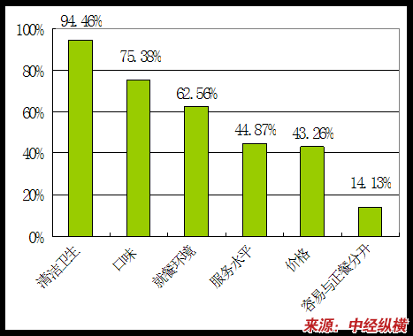 33.69%的人最常吃的快餐是西式的,而61.73%的人最钟情的仍是中式快餐。由此看来,只要发扬所长,学习先进的经营管理方式和理念,满足消费者的需求,中式快餐的阵地还值得坚守并有望扩大。如下图所示,绝大多数的消费者会较多考虑清洁卫生程度(94.46%),其次为口味(75.38%),就餐环境(62.56%),其他因素被较多考虑的比例均不到50%。