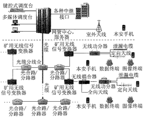 系统主要由地面局端机(包括服务器、操作维护子系统、无线交换机、基站控制器、基站、功率分配器、功率合成器、近端光模块)、井下覆盖网(包括光分线盒、光合路/分路器、矿用无线信号变换器、线耦合器、无线功分器、漏泄电缆、定向天线)及相应的终端设备(包括数据终端、视频终端、无线手机等)等组成。