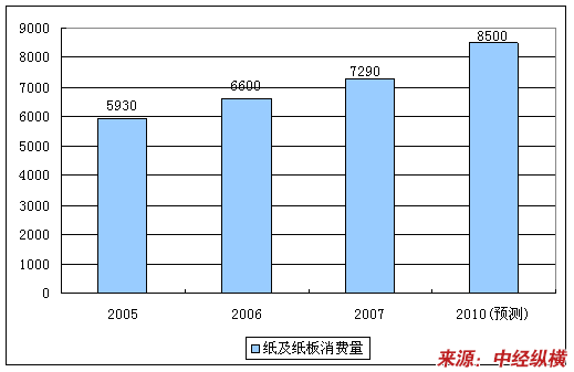 中国纸及纸板过去十几年的消费增长速度明显超过全球平均水平,1996-2006年间,复合增长率达到8.1%,而全球1995-2005期间的复合增长率只有2.9%。中国造纸业正在经历一段快速增长时期。