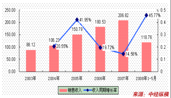 近年来,我国金属压力容器 行业 取得了较快发展。2003-2007年,年平均市场容量增长率达到23.78%,年平均利润增长率为26.68%。2007年纳入统计计划的367家企业总资产达到187.69亿元,全年共实现销售收入206.82亿元,完成工业总产值213.07亿元。