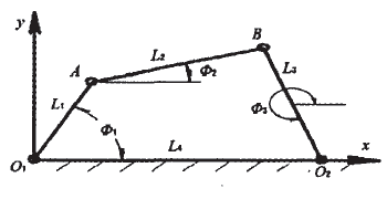 设曲柄栏杆机构的主动件L1的角位移φ1,角速度φ2。和角加速度φ3。。