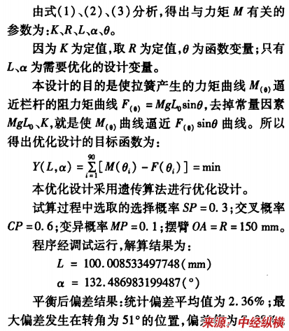 利用优化后的L、α可以确定弹簧相对于摆臂的始固定位置,弹簧平衡机构的几何尺寸就精确得出。再通过L、K、δLmax一就可确定弹簧的设计参数。