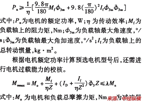 电机功率计算不仅要满足克服负载阻力矩,还要有足够的功率使负载作加速运动。选型时电机功率计算公式为: